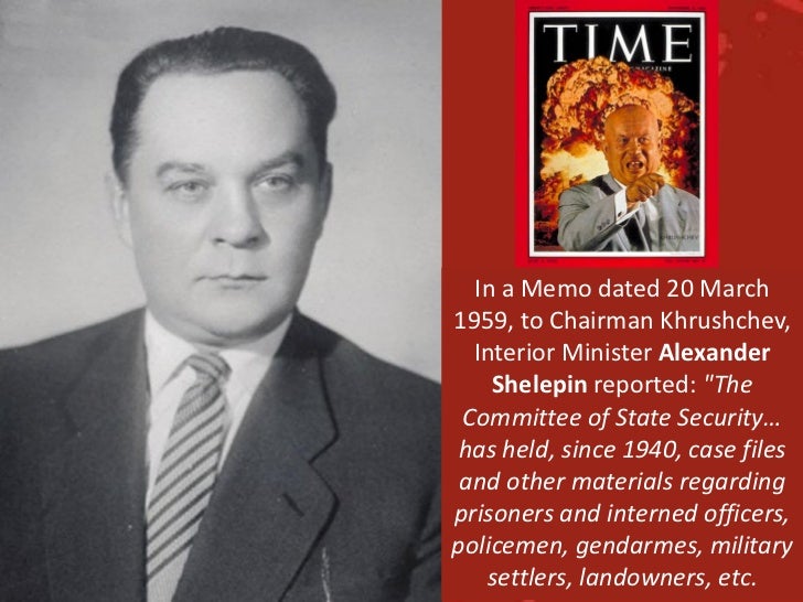 - 79. In a Memo dated 20 March1959, to Chairman Khrushchev, Interior Minister Alexander Shelepin reported: "The Committee of State Security…has held, since 1940, case files and other materials regardingprisoners and interned officers,policemen, gendarmes, military settlers, landowners, etc.