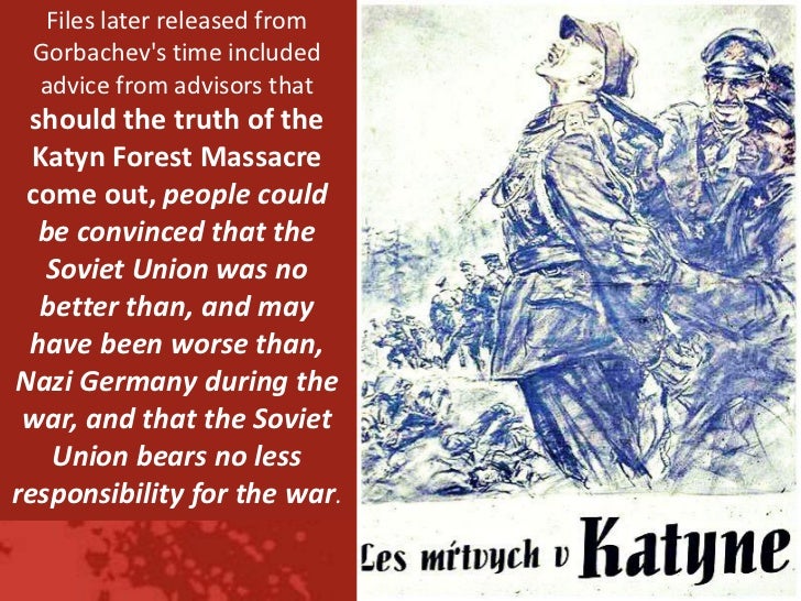 - 88. Files later released from Gorbachevs time included advice from advisors that should the truth of the Katyn Forest Massacre come out, people could be convinced that the Soviet Union was no better than, and may have been worse than,Nazi Germany during the war, and that the Soviet Union bears no lessresponsibility for the war.
