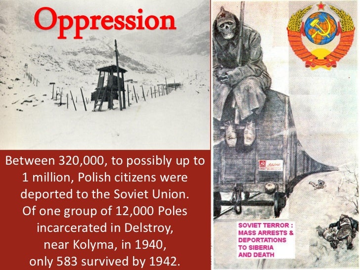 - 93. OppressionBetween 320,000, to possibly up to 1 million, Polish citizens were deported to the Soviet Union. Of one group of 12,000 Poles incarcerated in Delstroy, near Kolyma, in 1940, only 583 survived by 1942.