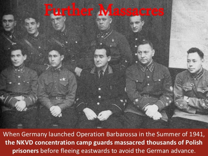 - 98. Further MassacresWhen Germany launched Operation Barbarossa in the Summer of 1941,the NKVD concentration camp guards massacred thousands of Polish prisoners before fleeing eastwards to avoid the German advance.