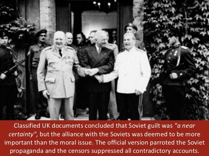 - 31. Classified UK documents concluded that Soviet guilt was "a near certainty", but the alliance with the Soviets was deemed to be moreimportant than the moral issue. The official version parroted the Soviet propaganda and the censors suppressed all contradictory accounts.