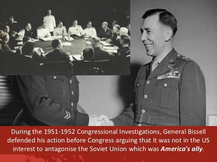 - 38. During the 1951-1952 Congressional Investigations, General Bisselldefended his action before Congress arguing that it was not in the US interest to antagonise the Soviet Union which was Americas ally.