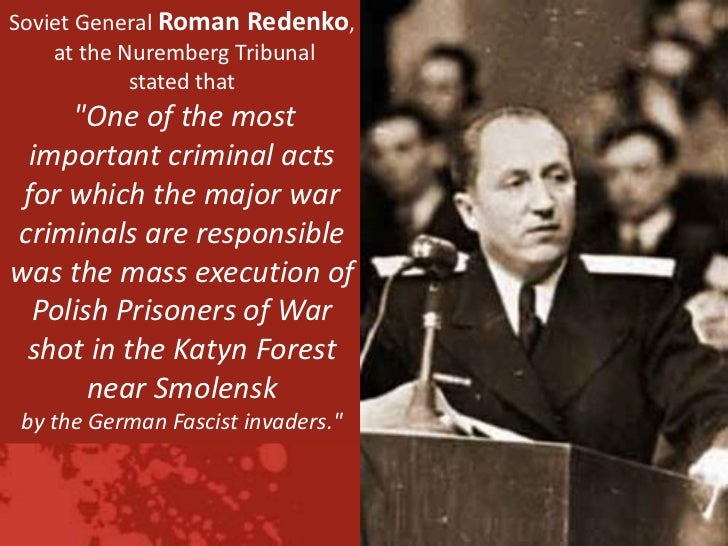 - 40. Soviet General Roman Redenko, at the Nuremberg Tribunal stated that "One of the most important criminal acts for which the major warcriminals are responsiblewas the mass execution of Polish Prisoners of War shot in the Katyn Forest near Smolensk by the German Fascist invaders."