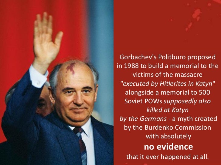 - 53. Gorbachevs Politburo proposedin 1988 to build a memorial to the victims of the massacre "executed by Hitlerites in Katyn" alongside a memorial to 500 Soviet POWs supposedly also killed at Katyn by the Germans - a myth created by the Burdenko Commission with absolutely no evidence that it ever happened at all.