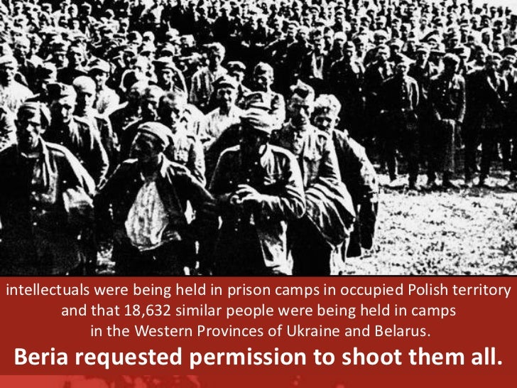 - 68. intellectuals were being held in prison camps in occupied Polish territory and that 18,632 similar people were being held in camps in the Western Provinces of Ukraine and Belarus. Beria requested permission to shoot them all.